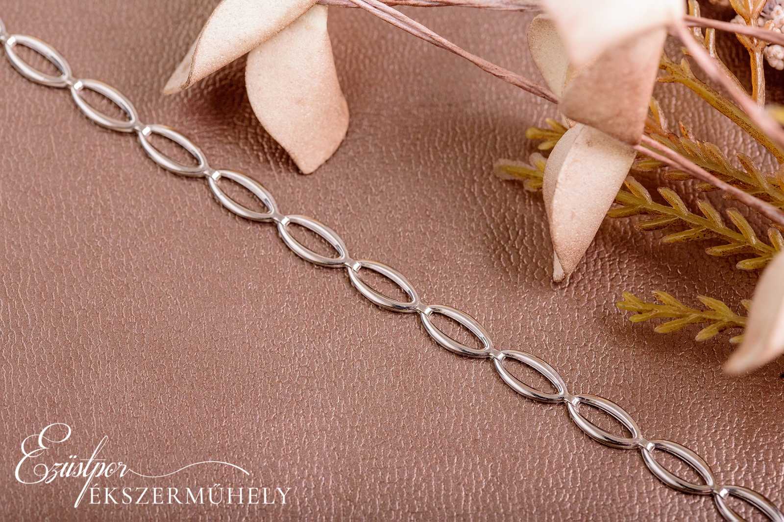 Kiváló minőségű fehérarany karkötő, amely 585-ös finomságú aranyból készült, préselt szemezésű fazon. Hivatalos magyar fémjellel ellátott.