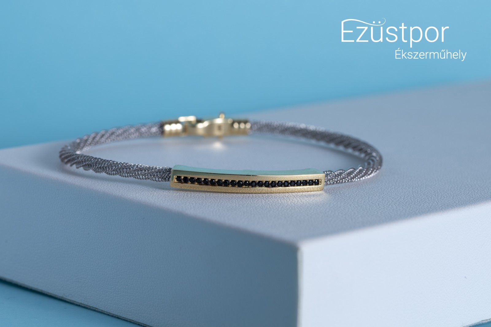 Kiváló minőségű sárga és fehérarany karkötő, amely 14 karátos finomságú aranyból készült. Hivatalos magyar fémjellel ellátott. A fehérarany rész különleges sodrony jellegű, a sárga arany részt fekete kövekkel díszítették.