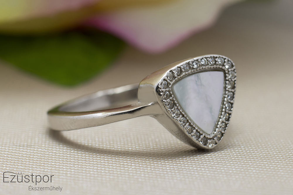 Ezüst gyűrű, kagylóval és cirkónia kövekkel. Súly:3,07gr. EGY001137